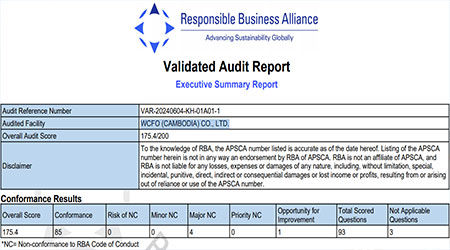 祝賀華耀(柬埔寨)有限公司 WCFO (CAMBODIA) CO., LTD. 2024年快速通過RBA認證并順利取得銀牌