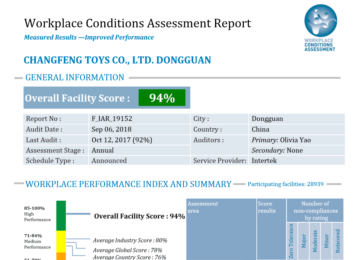 祝賀東莞市長豐玩具有限公司順利通過ITS WCA驗廠,并取得94分的成績